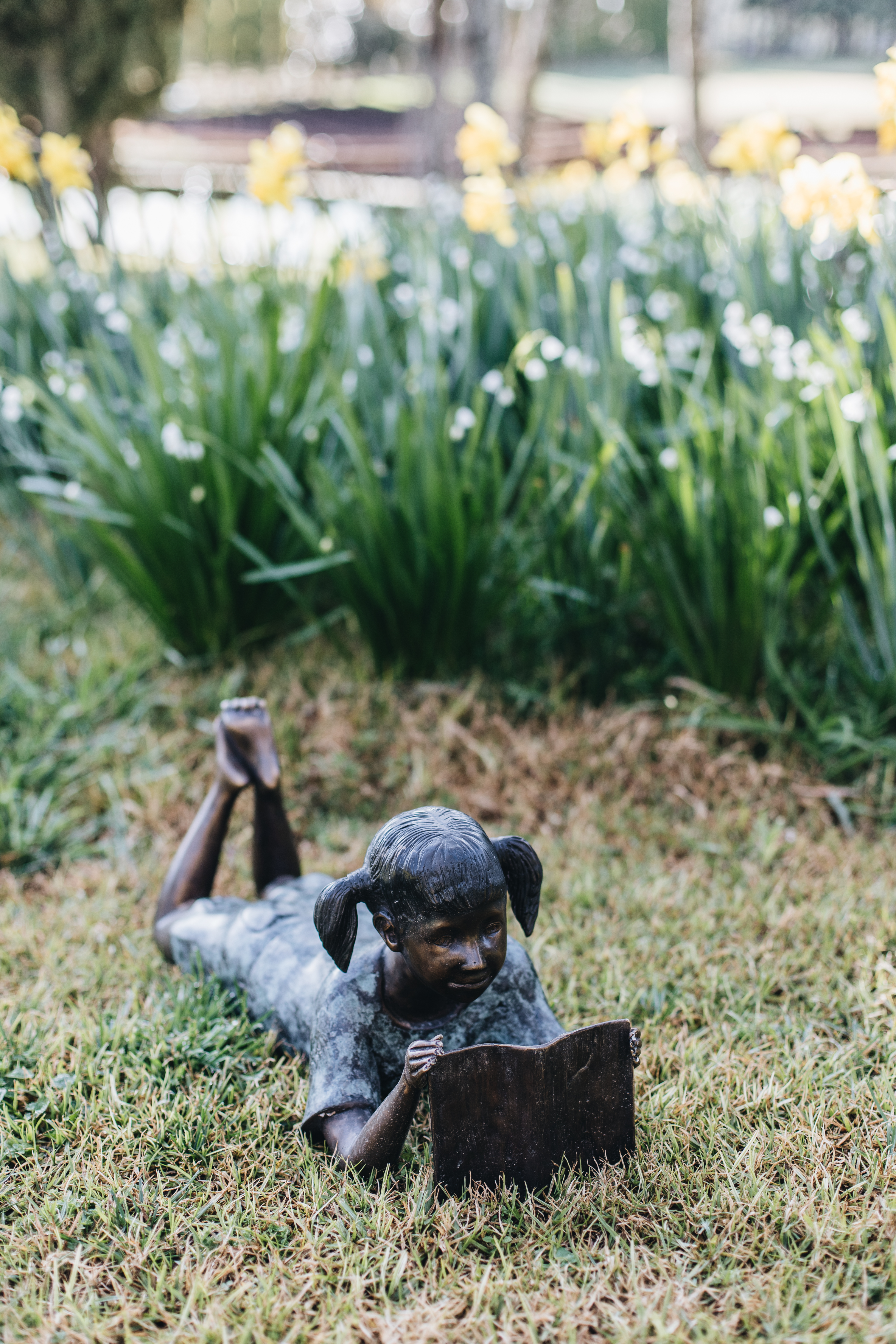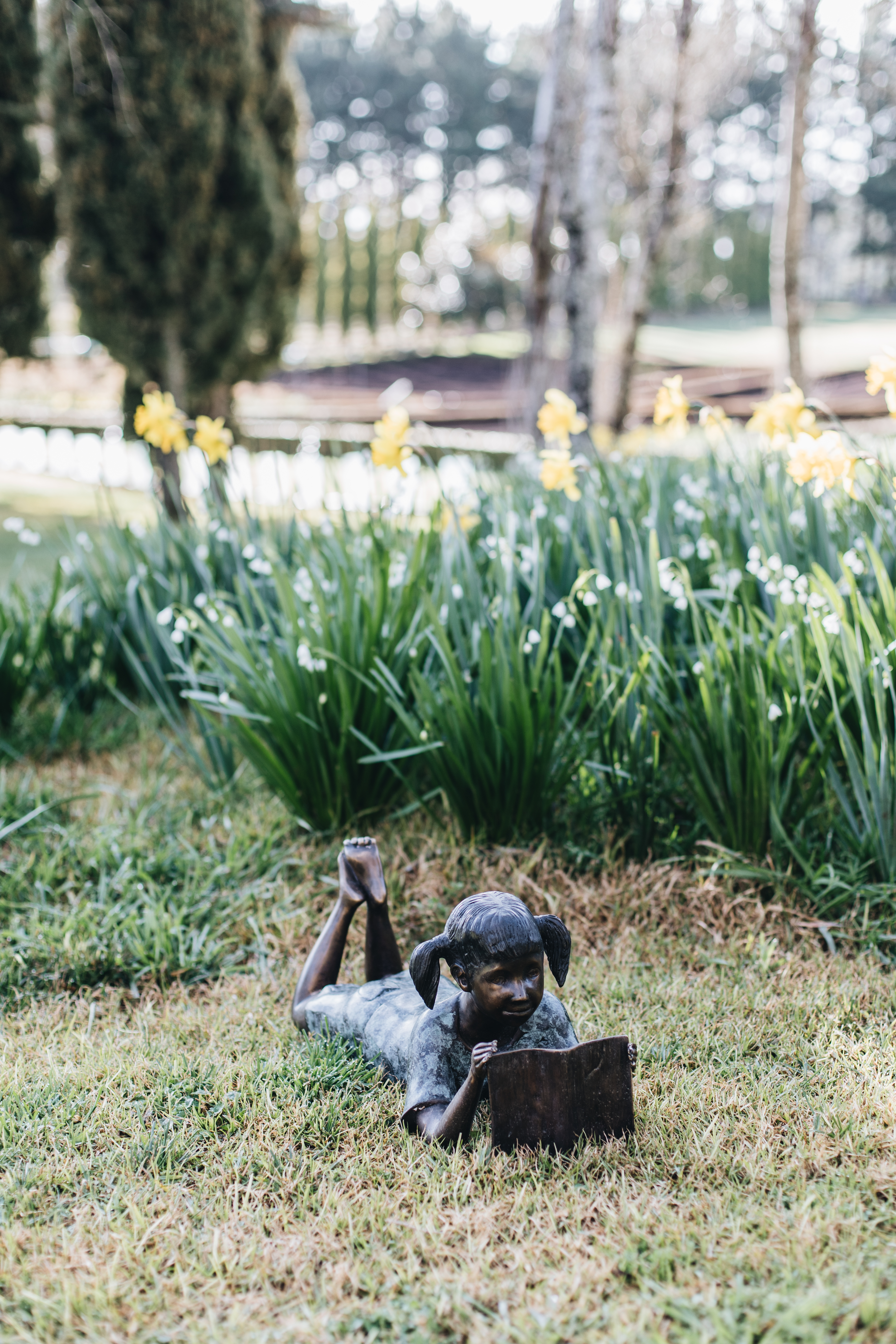 a bronze sculpture of a boy fishing, plumbed as a fountain.