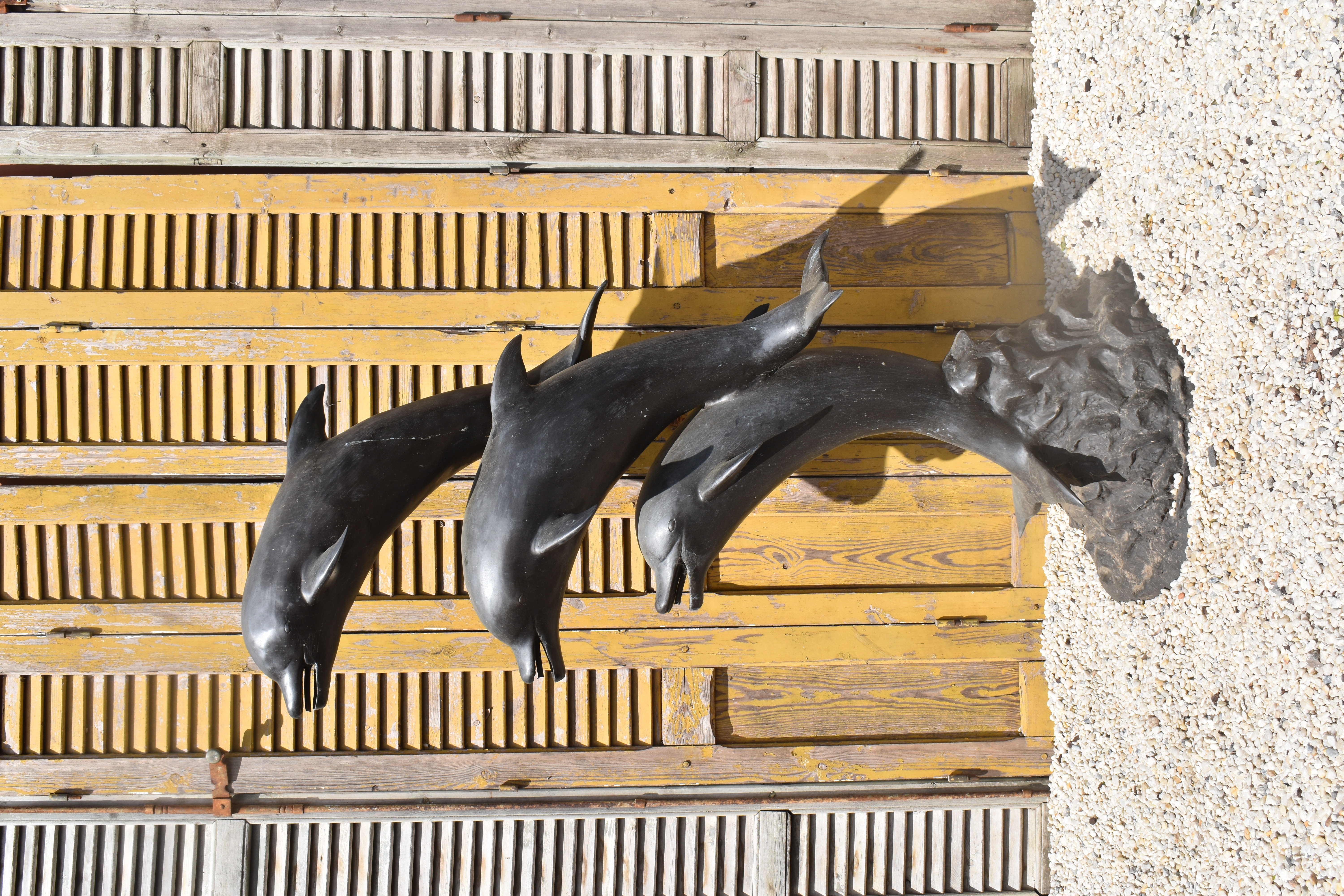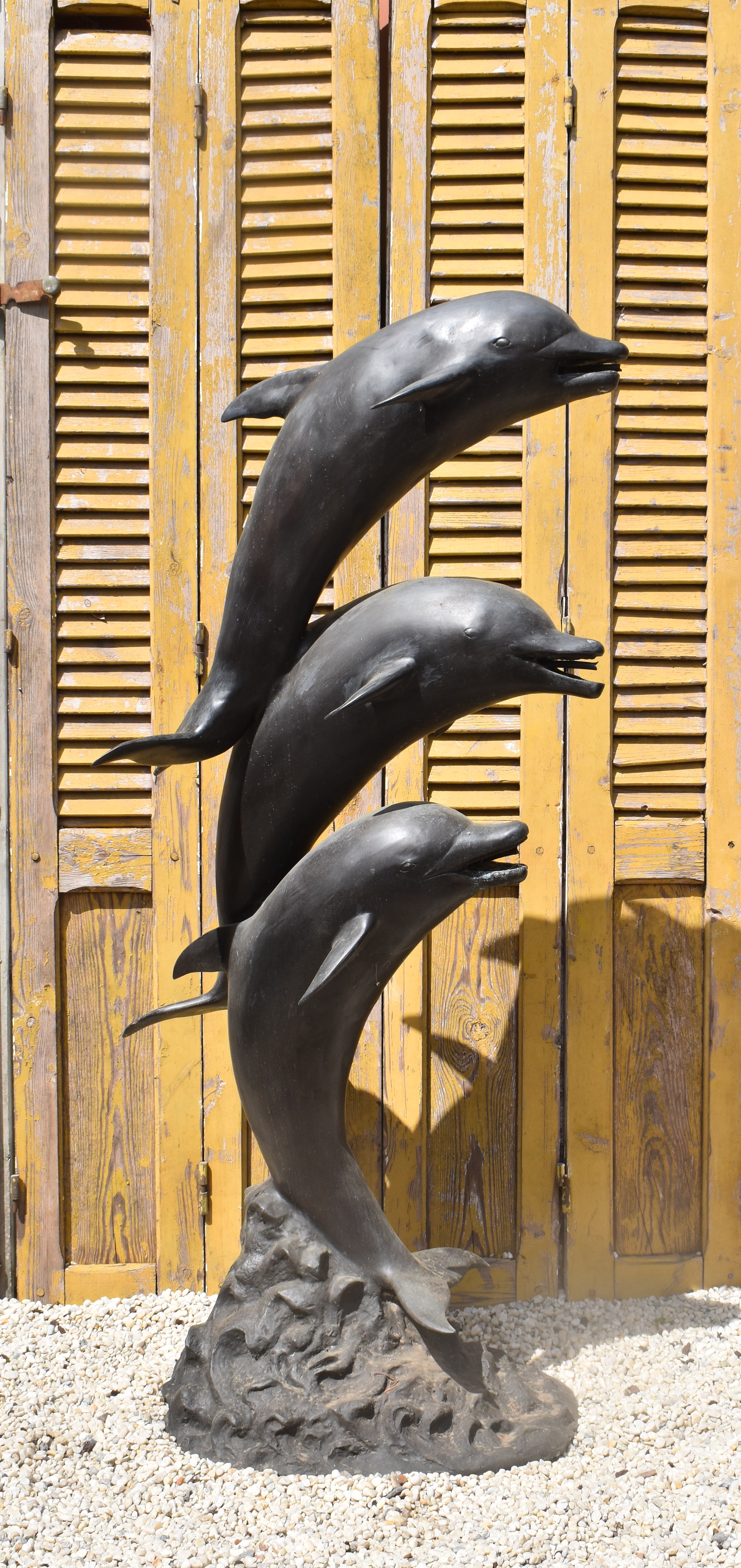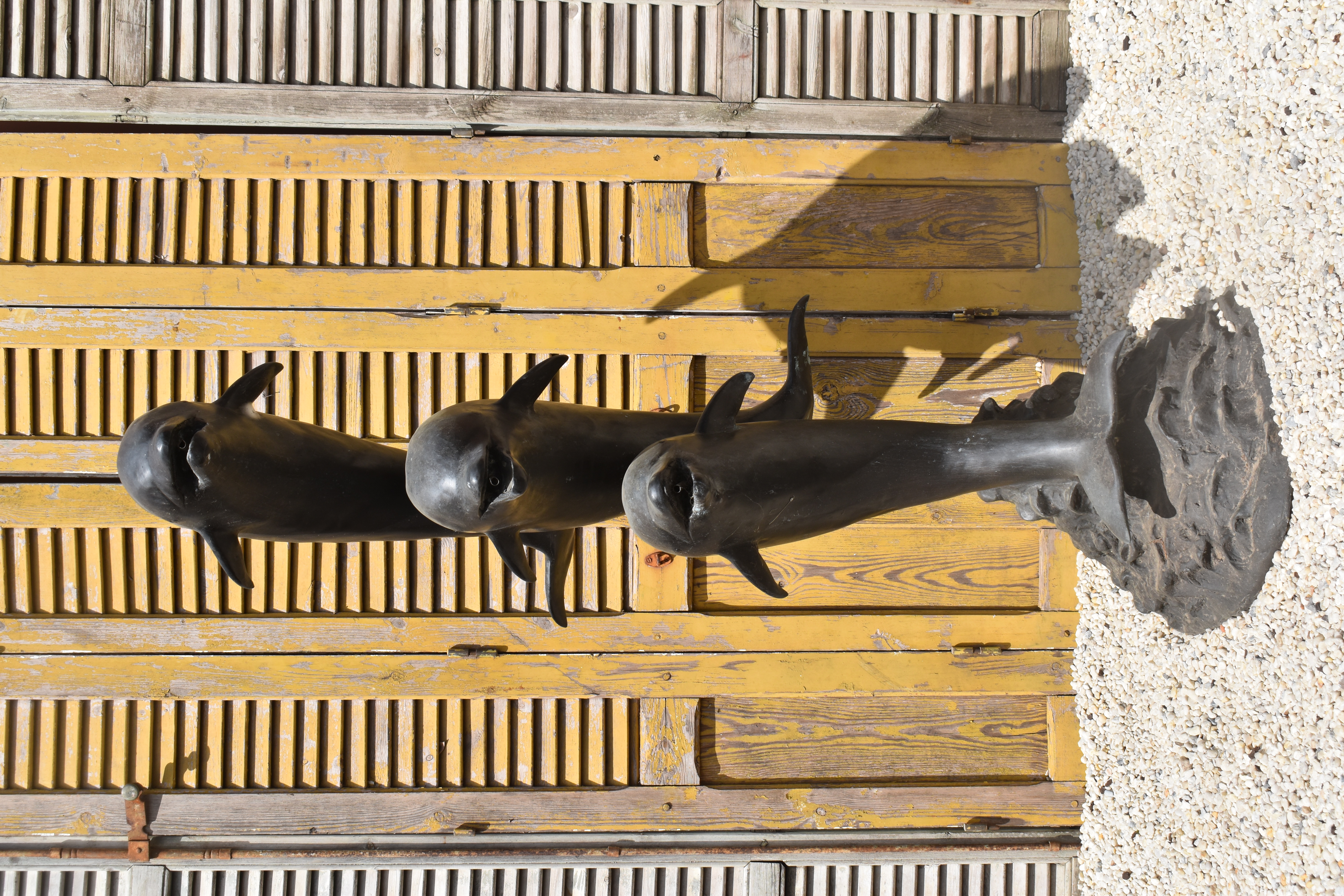 a bronze sculpture of 3 dolphins, plumbed as a fountain.