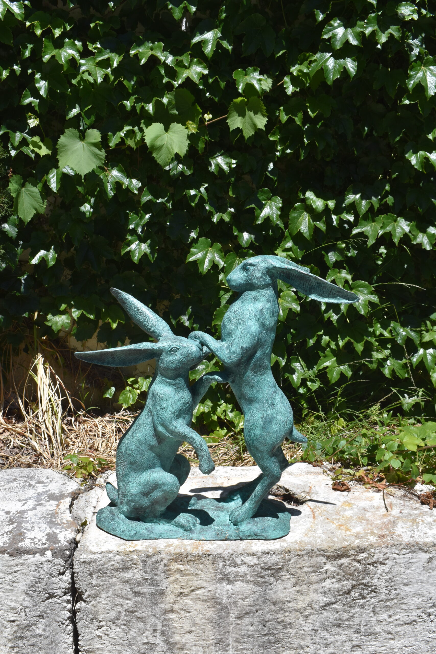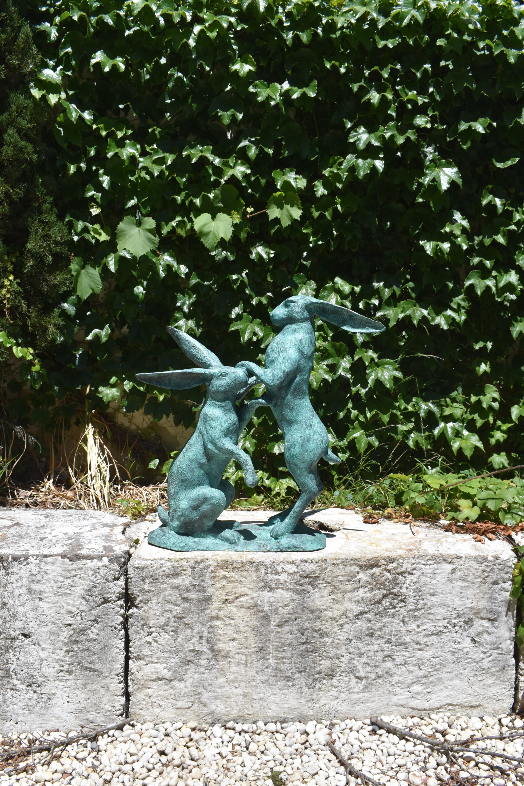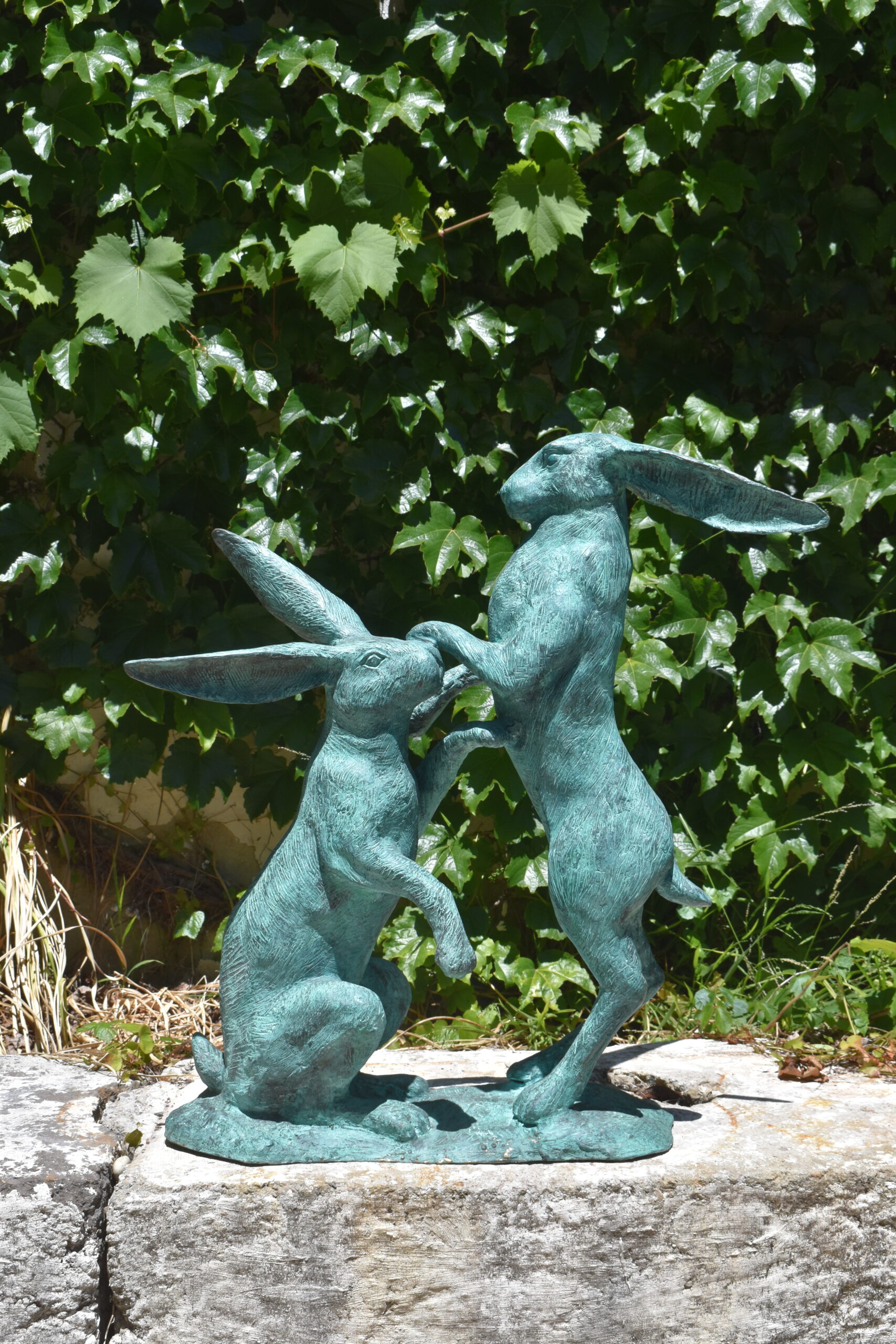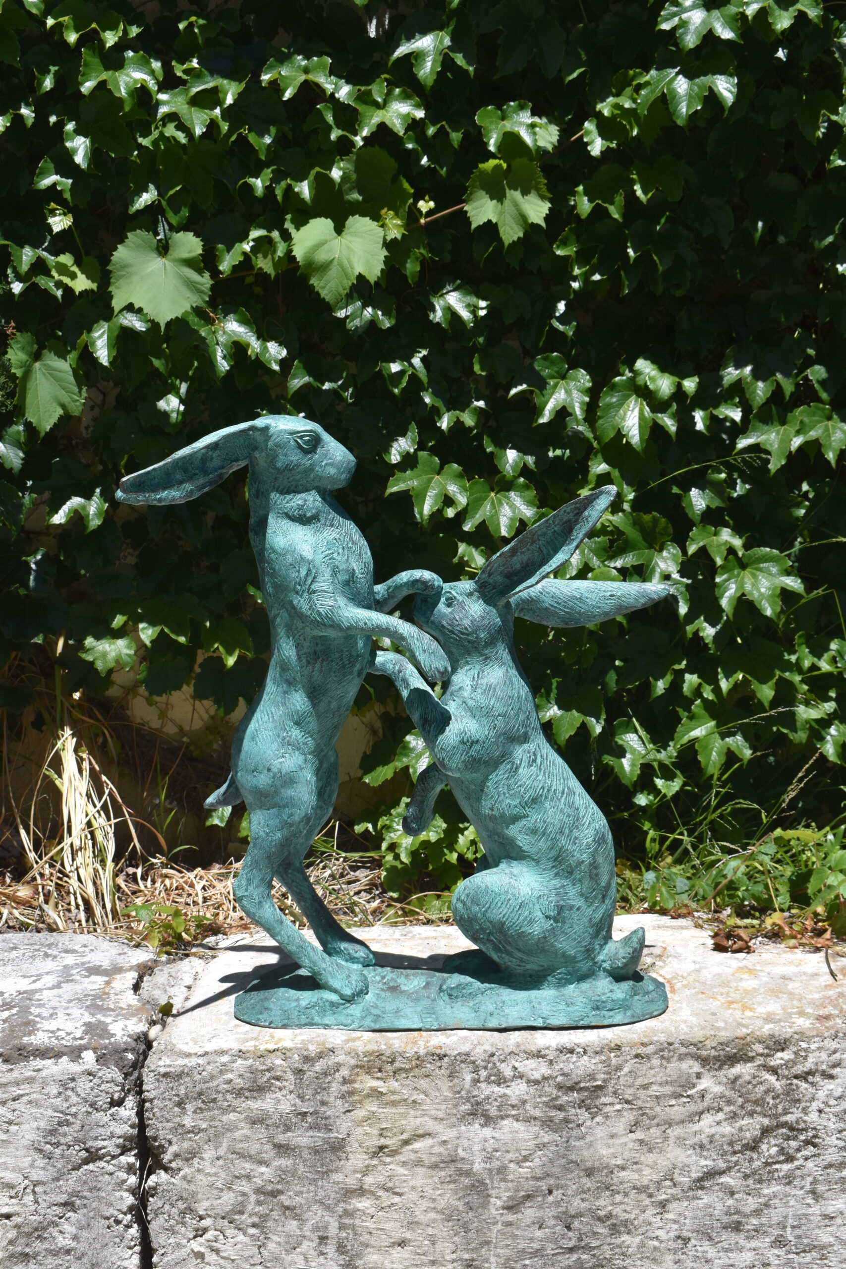 a bronze sculpture of boxing hares
