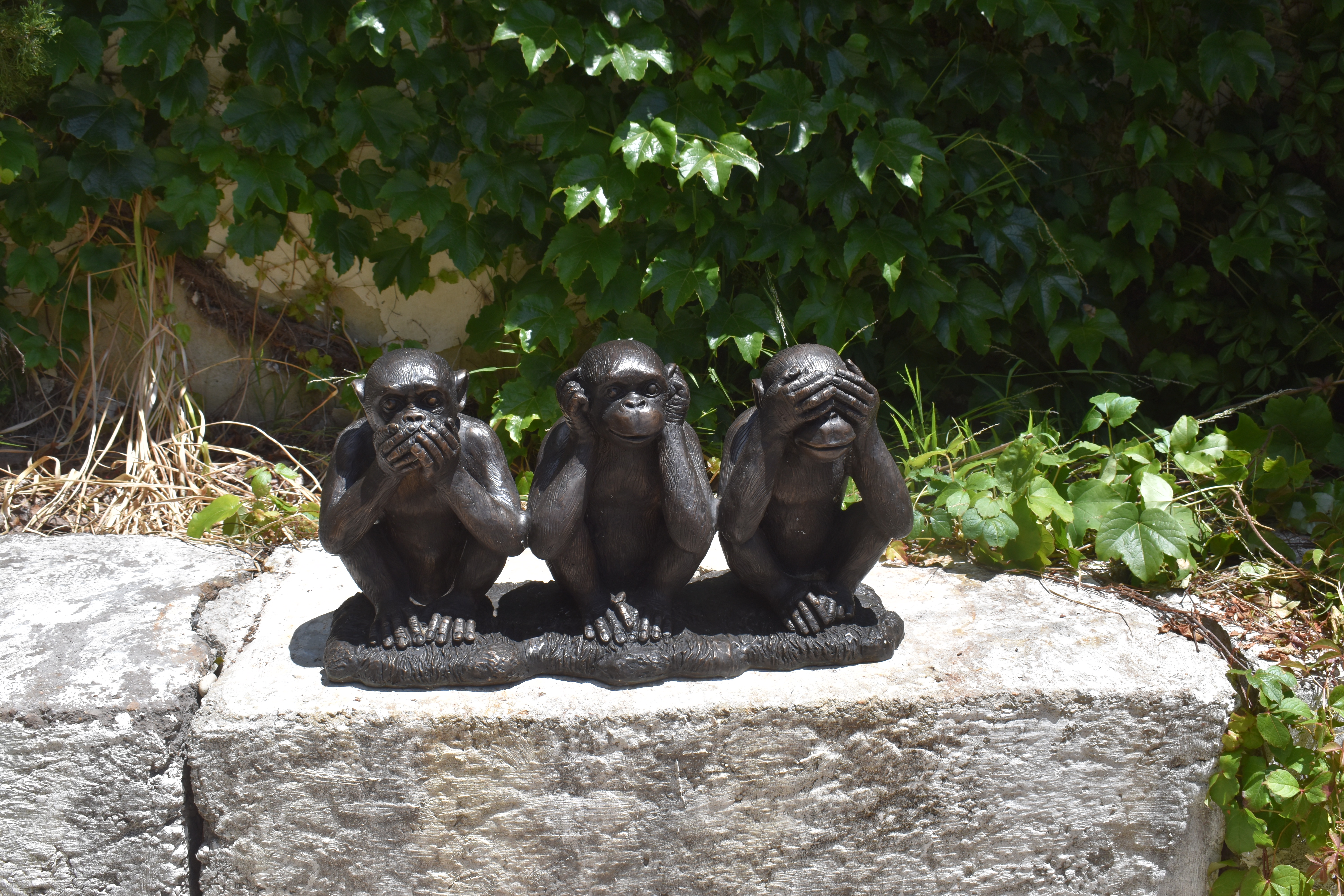 A bronze statue of 3 monkeys representing hear no evil, speak no evil, see no evil