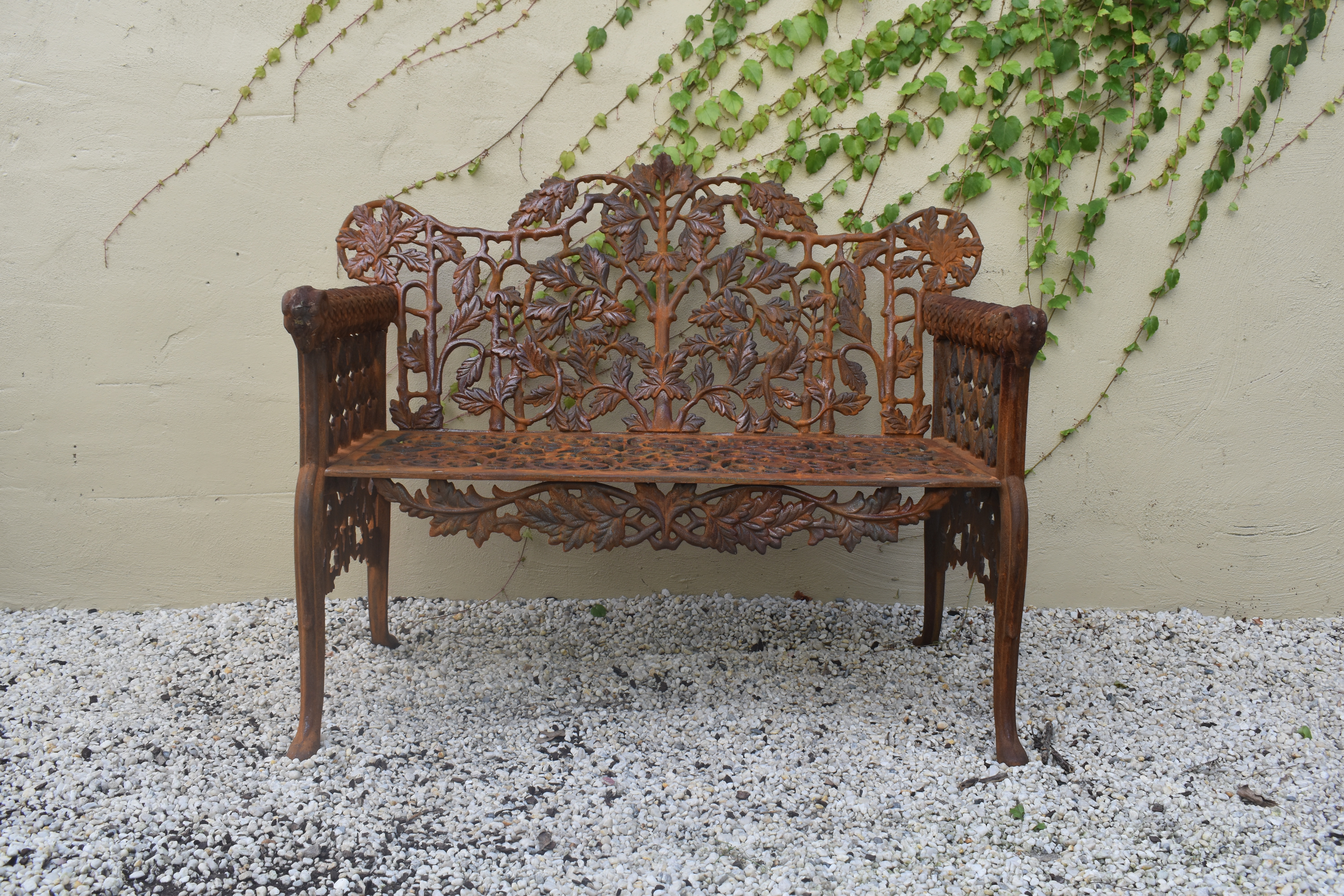 A cast iron Coalbrookdale style Oak and Ivy pattern bench,