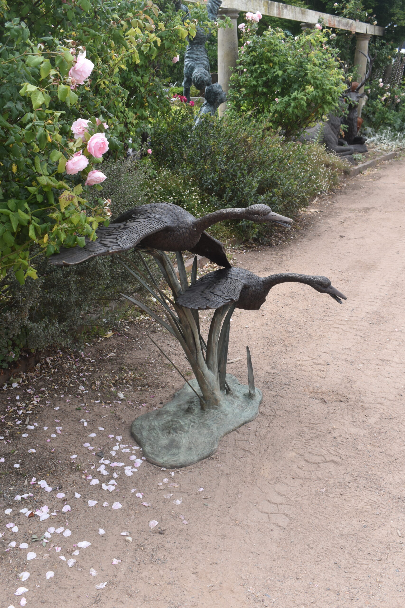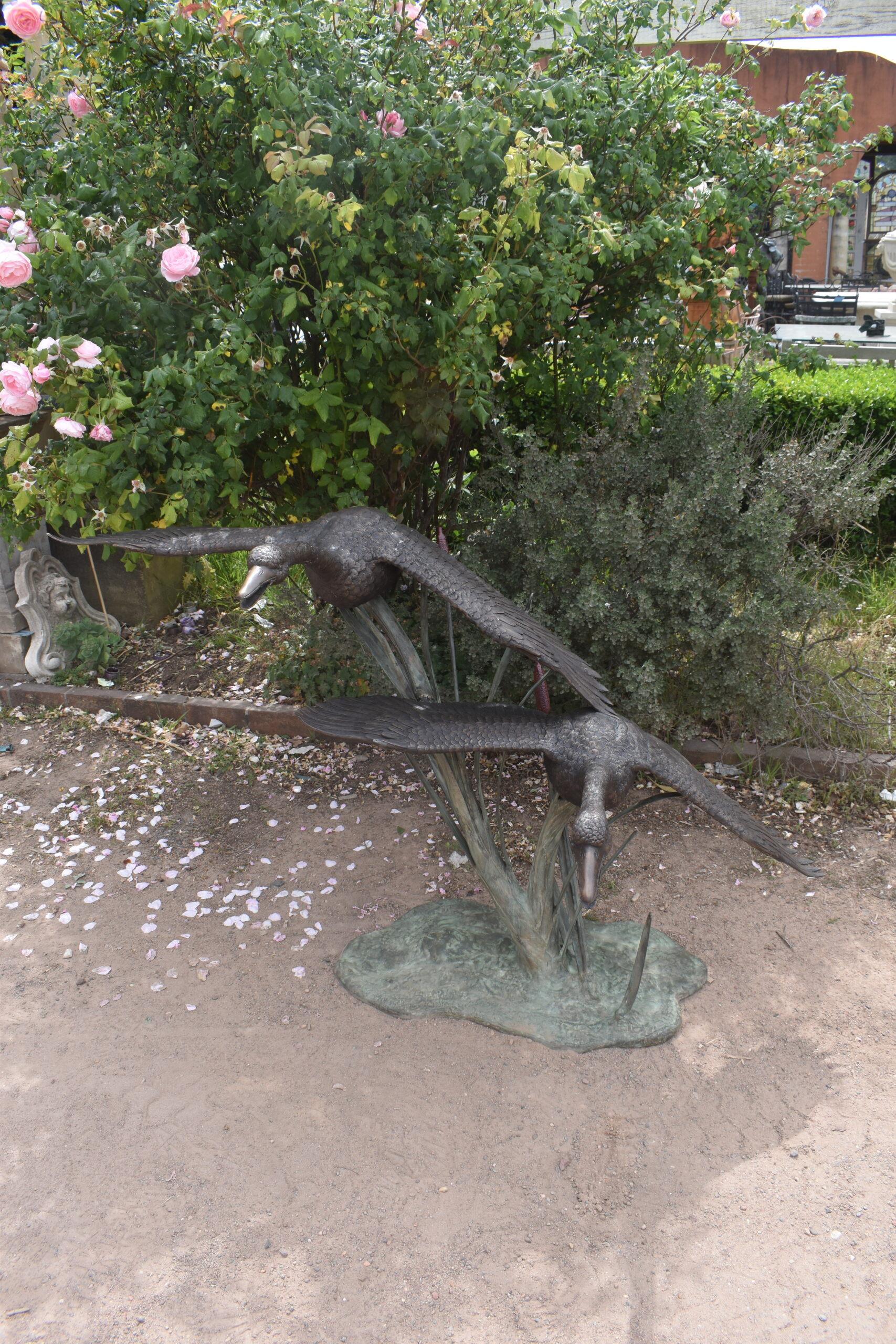 two bronze geese, plumbed as fountains.